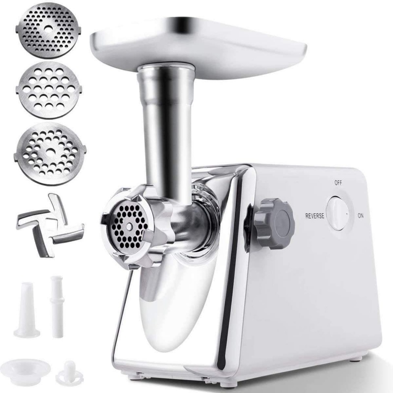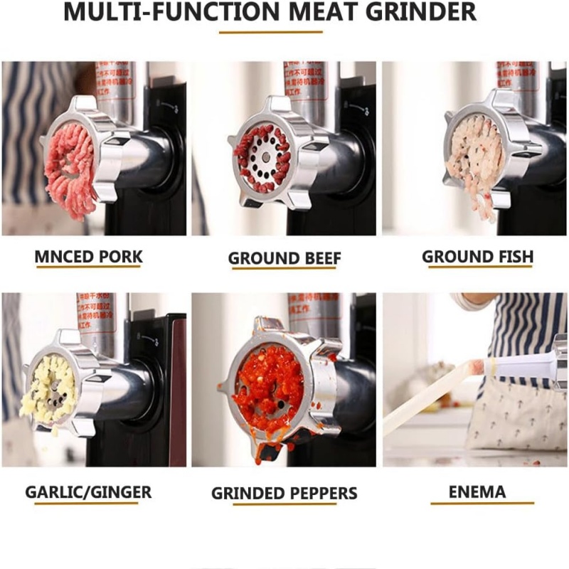 Multifunctional:Grinder The electric meat grinder comes with 3 cutting plates (Scalloped blade, 5mm, 7mm), 1 Enema stick, 1 meatball machine. Perfect for chopping meat, slicing vegetables and handling all kinds of ingredients.