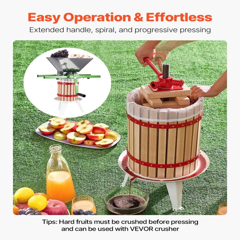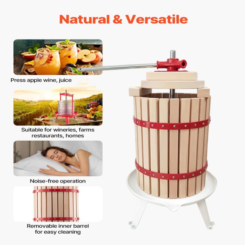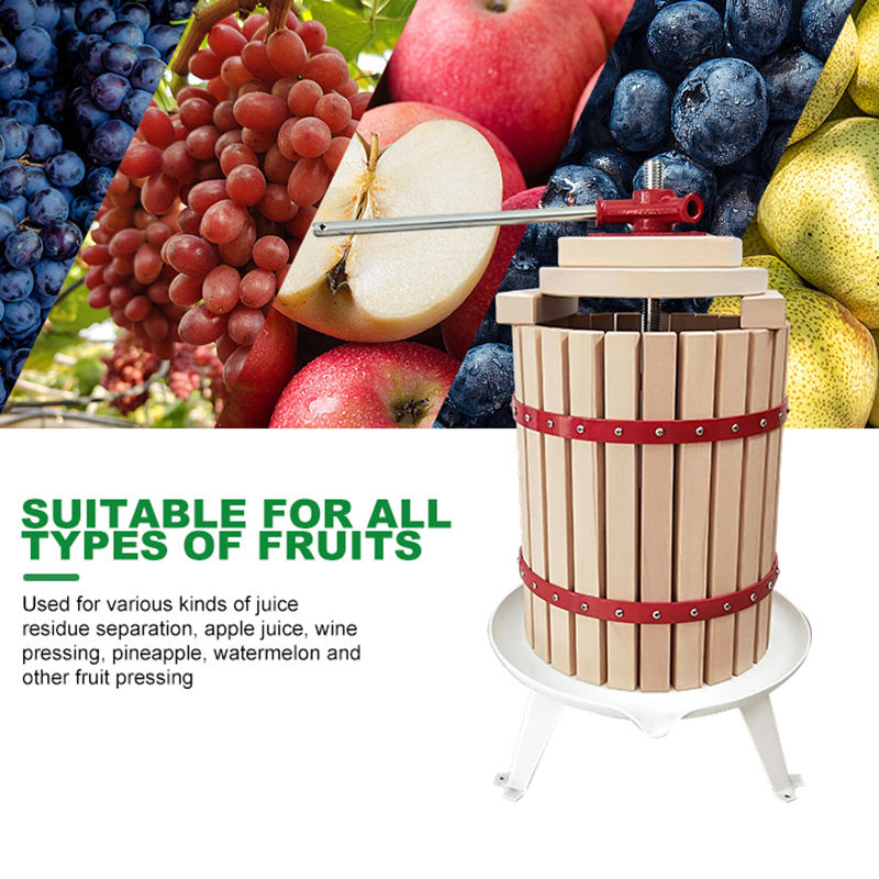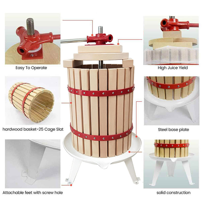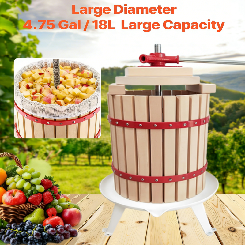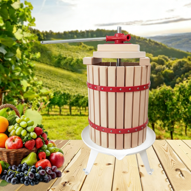 This 18L fruit press combines traditional craftsmanship with modern efficiency. The solid wood basket ensures durability, while the threaded pressing mechanism with its cast iron handle provides powerful, controlled juice extraction. It includes a fine filter bag for clearer results and easy cleanup. Importantly, it carries LFGB food-grade certification, guaranteeing safety for all your pressing needs. Finished in a classic white and red design, it is as visually appealing as it is functional. Ideal for home cider makers, winemakers, and juicing enthusiasts, this press is a reliable tool for transforming fruits into delicious, fresh juices.