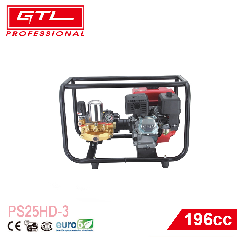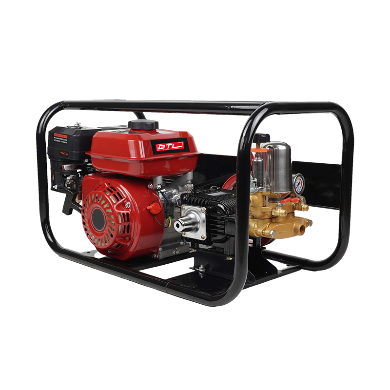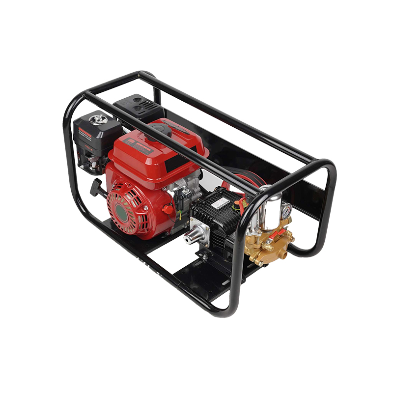 This gasoline-powered pressuresprayer is equipped with a 196cc 1-cylinder 4-stroke air-cooled OHV engine, delivering 6.5HP max power. It features 3×30mm plungers, 30-40L/min suction volume, and 2.5-4.0Mpa working pressure, making it ideal for heavy-duty cleaning tasks requiring strong water flow and pressure.
