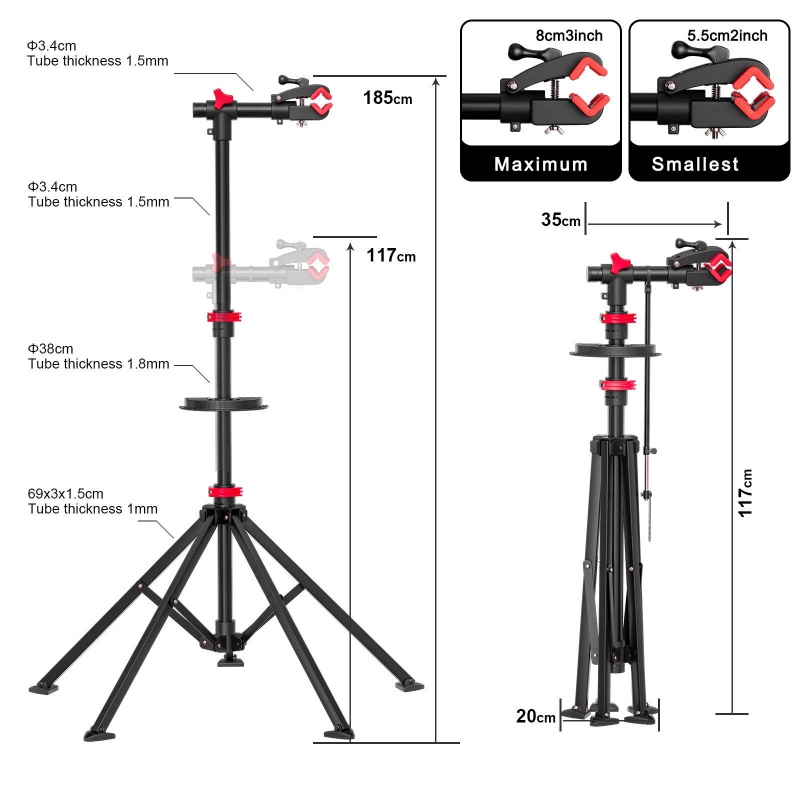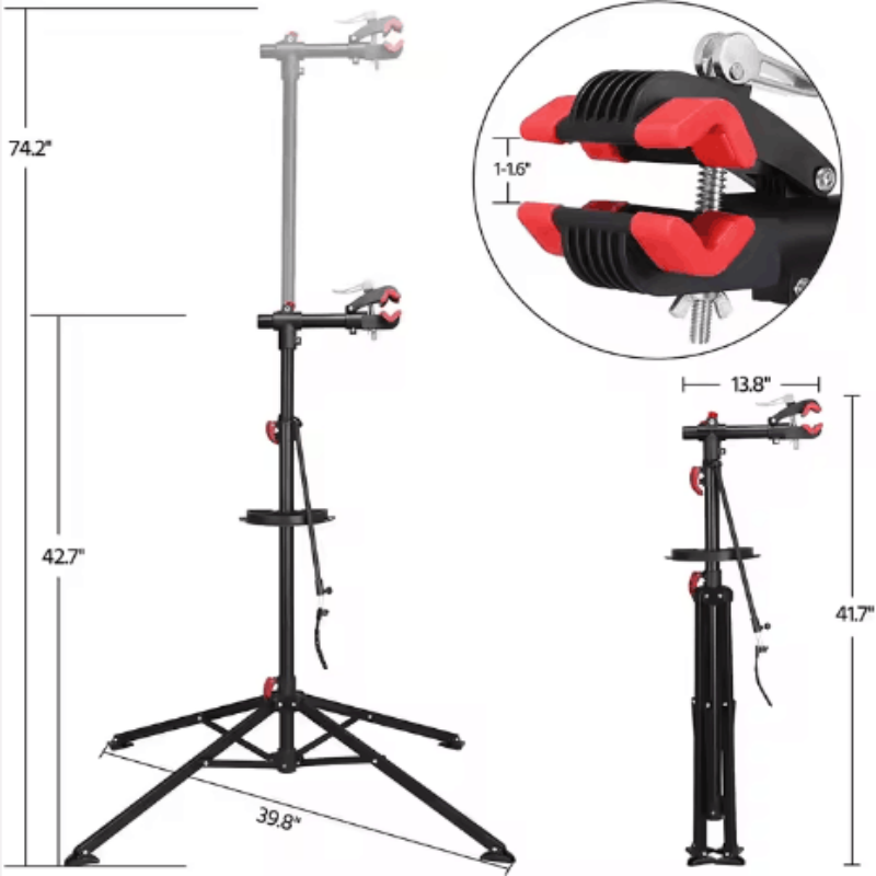 This easy-breezy bicycle repair stand is a maintenance essential, lifting bikes off the ground for stable, comfortable work. Portable and compact for storage/travel, it features 46"-78" height adjustment, a 360° rotating clamp and tripod 5-leg anti-slip base (ground-fixable). It supports 30kg bikes (25-45mm tubes), fits road/mountain bikes, and comes with a magnetic plastic tool tray for easy access to repair supplies.