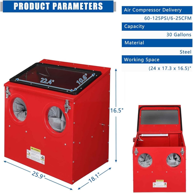 This professional-grade sandblasting cabinet is engineered for efficiency and power. Its large 100L capacity and 30 lb abrasive hopper support extended work sessions on substantial components. Designed for robust performance, it operates at up to 80 PSI with a 7 mm nozzle for fast, effective cleaning. Excellent visibility is guaranteed by the spacious viewing window and an integrated internal light. The cabinet features a thoughtfully designed workspace within a compact footprint and includes a dedicated 2-1/2" dust port to maintain a clean and safe working environment. Built for demanding applications, this machine combines high capacity with user-centric features for superior results.