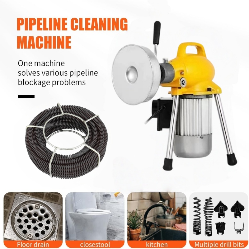 This 400W electric unblocker (220V~60Hz) comes with a 20m flexible cable, 7 interchangeable heads, and a cable rewinding tank, designed to clear clogs in various pipes efficiently.