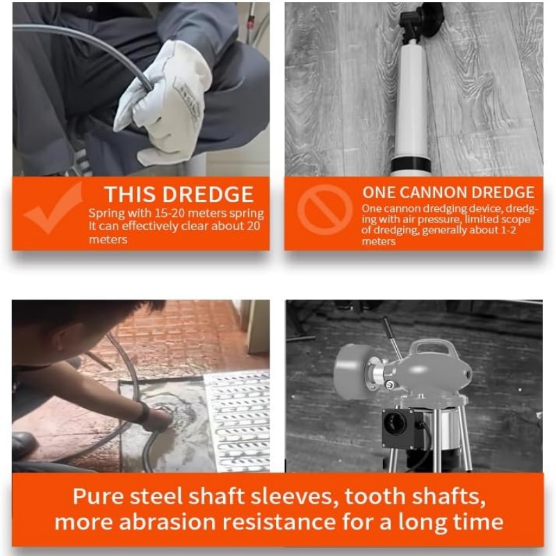 Core Performance: 400W induction motor (220V~60Hz) provides stable power for tackling tough clogs; 20m flexible cable reaches deep into long pipes.