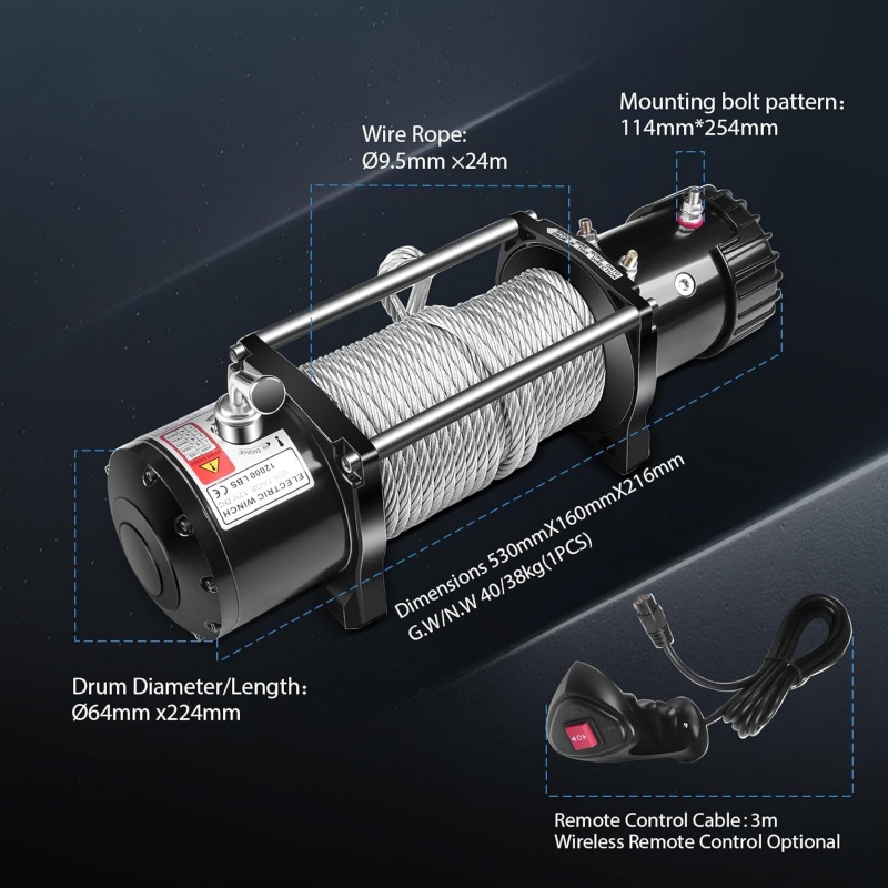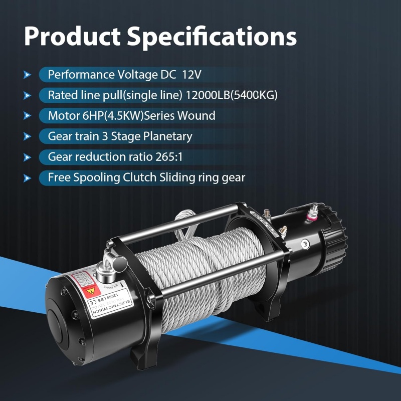 This 12V electric winch is built with a premium pure copper motor for stable and durable power. Boasting 12000LBS load capacity, it provides strong lifting and horizontal traction performance. The wireless remote control enables effortless and safe operation. Fitted with thick steel wire rope and a sturdy hook, it features solid construction. With fast lifting speed and compact size, it perfectly suits outdoor rescue, heavy hauling and daily engineering use.