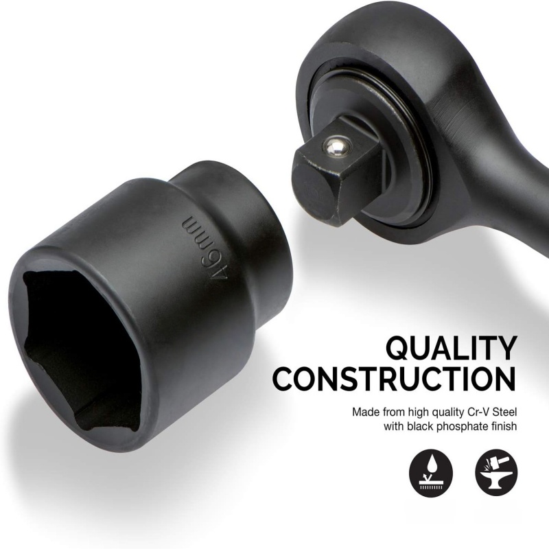 This 26pcs 3/4"" Impact Socket Set is ideal for heavy-duty work. It covers 17-65mm sockets to fit large-diameter bolts/nuts, plus T-type (stable force) and L-type (narrow spaces) handles. It also has 2 adaptors (3/4""X1/2"", 1""X3/4"") for tool compatibility, 200mm/400mm extension bars for hard-to-reach areas, and a 3/4"" ratchet head for quick operation-an all-in-one solution.