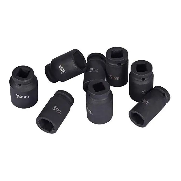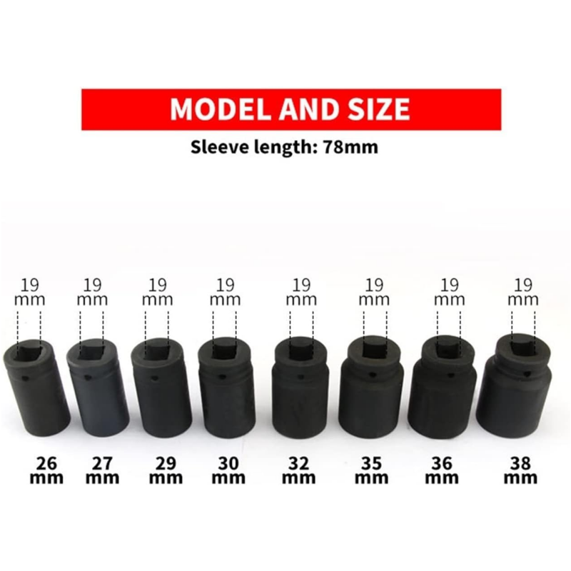 This 8-piece impact socket set covers 19-38mm large sizes (19/22/24/27/30/32/33/38mm) for heavy-duty tasks like machinery maintenance. Made of durable CR-V, it has high hardness and impact tolerance. Its 3/4-inch drive fits most standard impact tools, ideal for professional use.