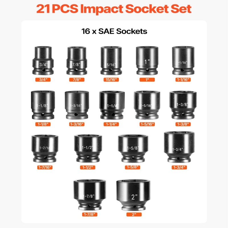 Complete 21-Piece Kit with Wide Size Coverage:This set includes 16 sockets (17-18-19-20-21-22-24-27-29-30-32-33-36-38-41-46mm) for large fasteners, plus 2 extension bars (100mm/200mm), 1 ratchet handle, and 1 slide bar-all-in-one to handle diverse heavy-duty tasks.