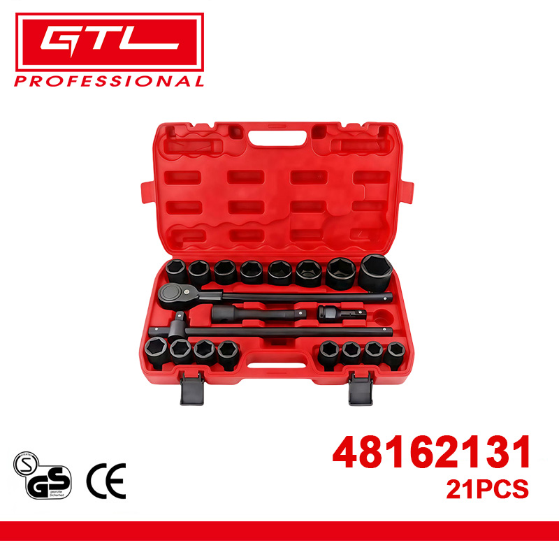 This 21-piece 3/4-inch impact socket set has 16 sockets (17-46mm:17/18/19/20/21/22/24/27/29/30/32/33/36/38/41/46mm), 2 extension bars (100mm/200mm), 1 ratchet handle & 1 slide bar. Made of durable CR-V, it's compatible with most 3/4-inch tools, reaches tight spaces, ideal for heavy-duty professional tasks.