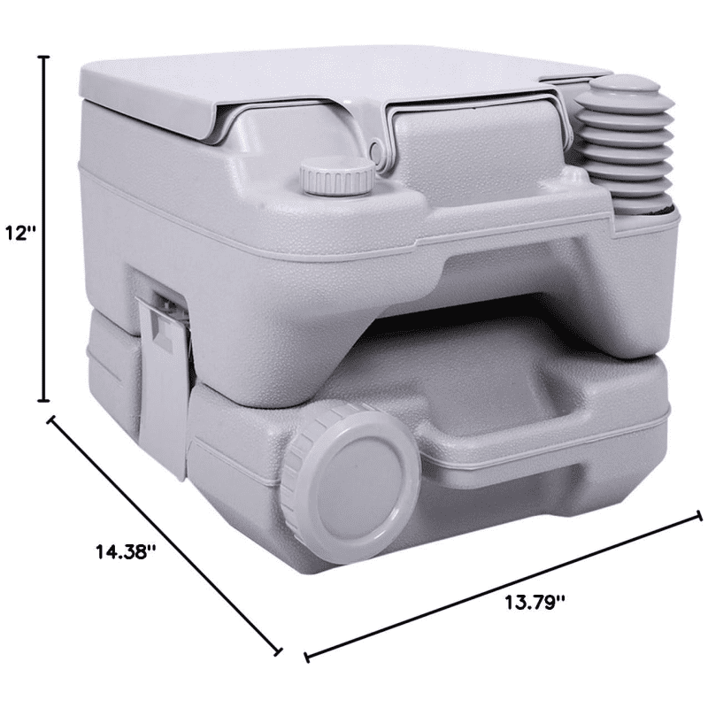 Large Capacity 10L Camping Toilet:Portable toilet with size of 14.38''(L)x13.79''(W)x12''(H), toilet seat size 13.7''x13.3'''', which is enough to meet the size of an adult seat.with 2.6 gallons (10L) of sewage storage capacity means you'll have to empty it less often and the 3.2-gallon (12L) fresh water capacity allows you to flush about so many times