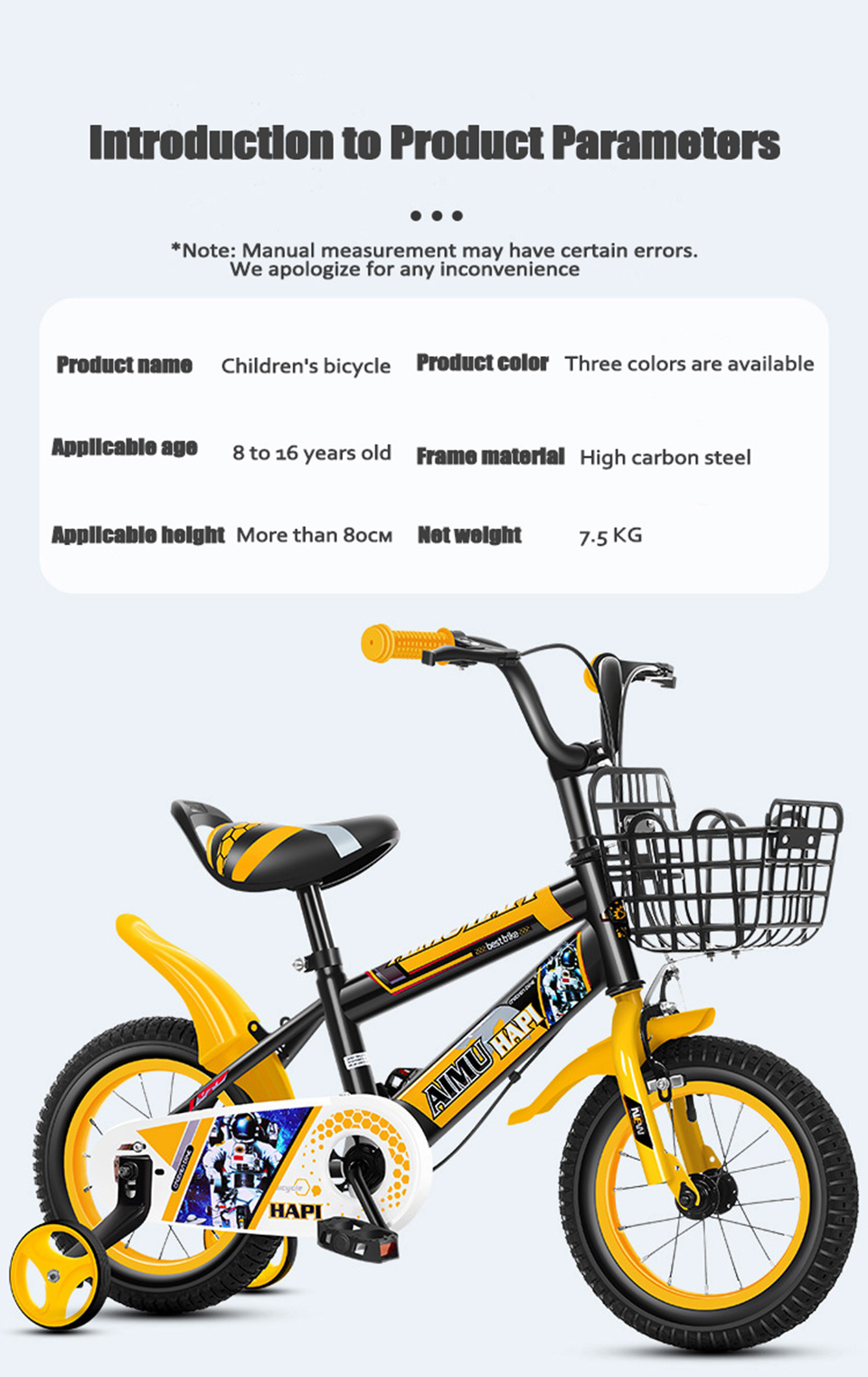 Introducing this Light Children's Bicycle—the perfect ride to make your kid fall in love with outdoor adventures! Designed for 8-16 year olds (height ≥80cm), this bike combines playful style with durable performance: it features a sleek black-and-yellow color scheme (with 2 other color options) and eye-catching astronaut-themed decals that kids will adore.
